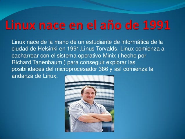 - 1. Linux nace de la mano de un estudiante de informática de laciudad de Helsinki en 1991,Linus Torvalds. Linux comienza acacharrear con el sistema operativo Minix ( hecho porRichard Tanenbaum ) para conseguir explorar lasposibilidades del microprocesador 386 y así comienza laandanza de Linux.