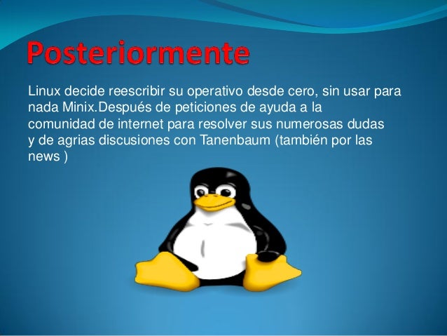 - 2. Linux decide reescribir su operativo desde cero, sin usar paranada Minix.Después de peticiones de ayuda a lacomunidad de internet para resolver sus numerosas dudasy de agrias discusiones con Tanenbaum (también por lasnews )