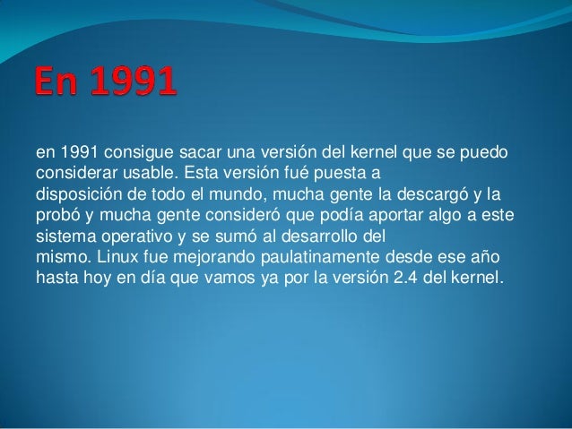- 3. en 1991 consigue sacar una versión del kernel que se puedoconsiderar usable. Esta versión fué puesta adisposición de todo el mundo, mucha gente la descargó y laprobó y mucha gente consideró que podía aportar algo a estesistema operativo y se sumó al desarrollo delmismo. Linux fue mejorando paulatinamente desde ese añohasta hoy en día que vamos ya por la versión 2.4 del kernel.
