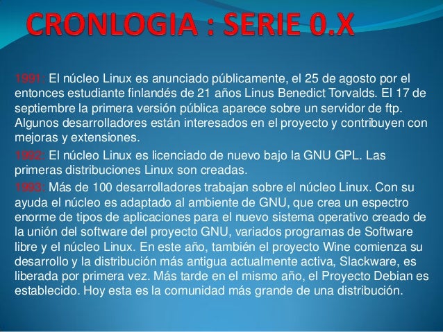 - 4. 1991: El núcleo Linux es anunciado públicamente, el 25 de agosto por elentonces estudiante finlandés de 21 años Linus Benedict Torvalds. El 17 deseptiembre la primera versión pública aparece sobre un servidor de ftp.Algunos desarrolladores están interesados en el proyecto y contribuyen conmejoras y extensiones.1992: El núcleo Linux es licenciado de nuevo bajo la GNU GPL. Lasprimeras distribuciones Linux son creadas.1993: Más de 100 desarrolladores trabajan sobre el núcleo Linux. Con suayuda el núcleo es adaptado al ambiente de GNU, que crea un espectroenorme de tipos de aplicaciones para el nuevo sistema operativo creado dela unión del software del proyecto GNU, variados programas de Softwarelibre y el núcleo Linux. En este año, también el proyecto Wine comienza sudesarrollo y la distribución más antigua actualmente activa, Slackware, esliberada por primera vez. Más tarde en el mismo año, el Proyecto Debian esestablecido. Hoy esta es la comunidad más grande de una distribución.