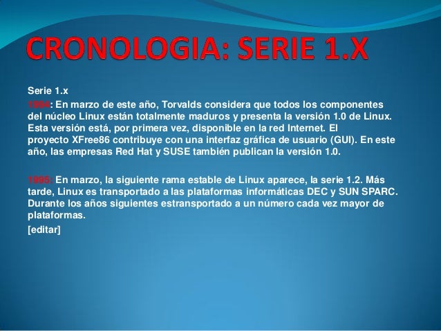 - 5. Serie 1.x1994: En marzo de este año, Torvalds considera que todos los componentesdel núcleo Linux están totalmente maduros y presenta la versión 1.0 de Linux.Esta versión está, por primera vez, disponible en la red Internet. Elproyecto XFree86 contribuye con una interfaz gráfica de usuario (GUI). En esteaño, las empresas Red Hat y SUSE también publican la versión 1.0.1995: En marzo, la siguiente rama estable de Linux aparece, la serie 1.2. Mástarde, Linux es transportado a las plataformas informáticas DEC y SUN SPARC.Durante los años siguientes estransportado a un número cada vez mayor deplataformas.[editar]