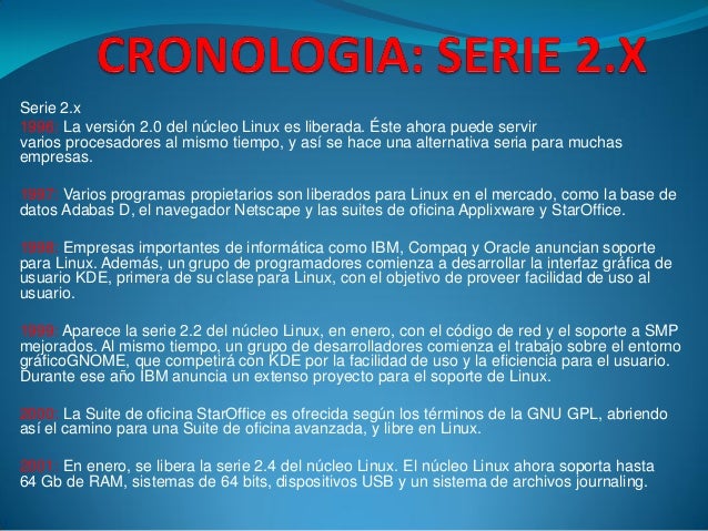 - 6. Serie 2.x1996: La versión 2.0 del núcleo Linux es liberada. Éste ahora puede servirvarios procesadores al mismo tiempo, y así se hace una alternativa seria para muchasempresas.1997: Varios programas propietarios son liberados para Linux en el mercado, como la base dedatos Adabas D, el navegador Netscape y las suites de oficina Applixware y StarOffice.1998: Empresas importantes de informática como IBM, Compaq y Oracle anuncian soportepara Linux. Además, un grupo de programadores comienza a desarrollar la interfaz gráfica deusuario KDE, primera de su clase para Linux, con el objetivo de proveer facilidad de uso alusuario.1999: Aparece la serie 2.2 del núcleo Linux, en enero, con el código de red y el soporte a SMPmejorados. Al mismo tiempo, un grupo de desarrolladores comienza el trabajo sobre el entornográficoGNOME, que competirá con KDE por la facilidad de uso y la eficiencia para el usuario.Durante ese año IBM anuncia un extenso proyecto para el soporte de Linux.2000: La Suite de oficina StarOffice es ofrecida según los términos de la GNU GPL, abriendoasí el camino para una Suite de oficina avanzada, y libre en Linux.2001: En enero, se libera la serie 2.4 del núcleo Linux. El núcleo Linux ahora soporta hasta64 Gb de RAM, sistemas de 64 bits, dispositivos USB y un sistema de archivos journaling.