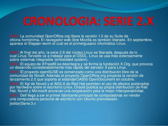 - 7. 2002: La comunidad OpenOffice.org libera la versión 1.0 de su Suite deoficina homónima. El navegador web libre Mozilla es también liberado. En septiembre,aparece el Slapper-worm el cual es el primergusano informático Linux.2003: Al final del año, la serie 2.6 del núcleo Linux es liberada, después de locual Linus Torvalds va a trabajar para el OSDL. Linux se usa más extensamentesobre sistemas integrados (embedded system).2004: El equipo de XFree86 se desintegra y se forma la fundación X.Org, que provocaun desarrollo considerablemente más rápido del servidor X para Linux.2005: El proyecto openSUSE es comenzado como una distribución libre de lacomunidad de Novell. Además el proyecto OpenOffice.org proyecta la versión delanzamiento 2.0 que soporta al estándarOASIS OpenDocument en octubre.2006: El Xgl de Novell y el AIGLX de Red Hat permiten el uso de efectos aceleradospor hardware sobre el escritorio Linux. Oracle publica su propia distribución de RedHat. Novell y Microsoft anuncian una cooperación para la mejor interoperabilidad.2007: Dell llega a ser el primer fabricante principal de computadoras en venderuna computadora personal de escritorio con Ubuntu preinstalado.[editar]Serie 3.x
